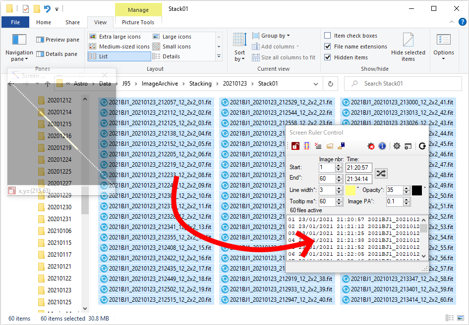 all 60 files have been selected in Windows File Explorer and have been dropped onto the Control window, filling the FITS area: |