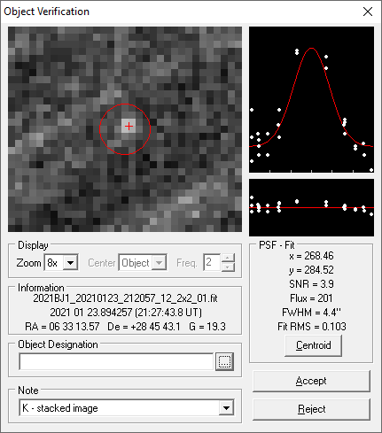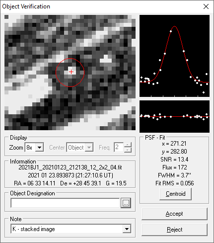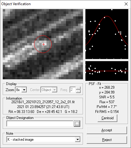 the good images restacked in Astrometrica to get a good astrometric measurement. Here is